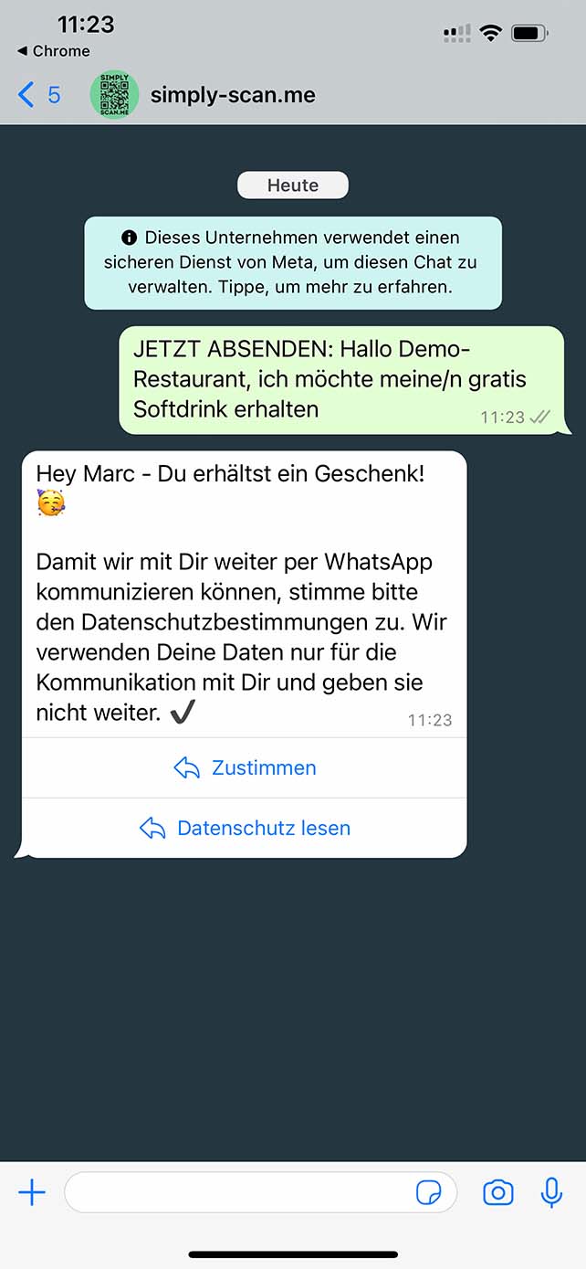 Der User aktiviert den Code für seinen Preis in einem vollautomatischen WhatsApp-Funnel. Darin wird er auch animiert, sich in Deinen persönlichen WhatsApp-Newsletters einzutragen. Vorher muss er noch den Datenschutzbestimmungen zustimmen.