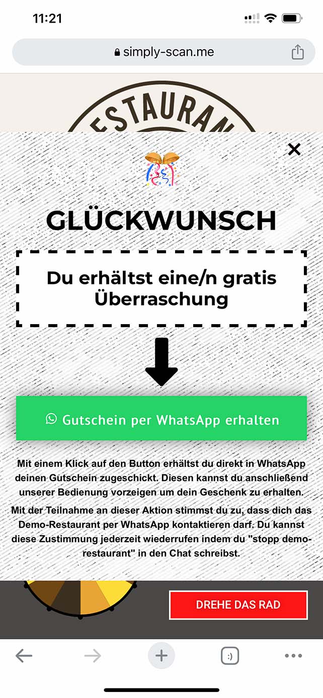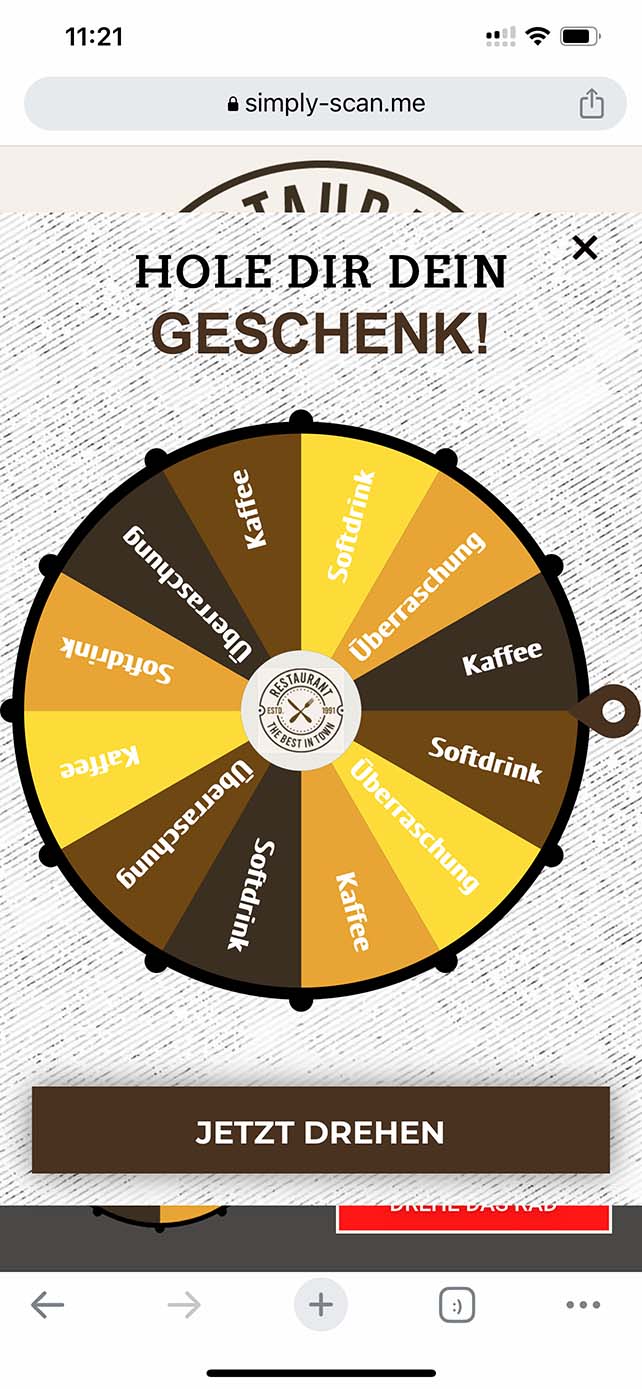 Wenn der User den Barcode über sein Smartphone eingescannt hat, landet er automatisch auf der individuellen Aktionsseite Deines Geschäfts oder Restaurant. Dort kann er auf Knopfdruck ein Glücksrad drehen, um ein Geschenk zu erhalten. Du bestimmst die Geschenke, die Du Deinen Kunden geben möchtest.