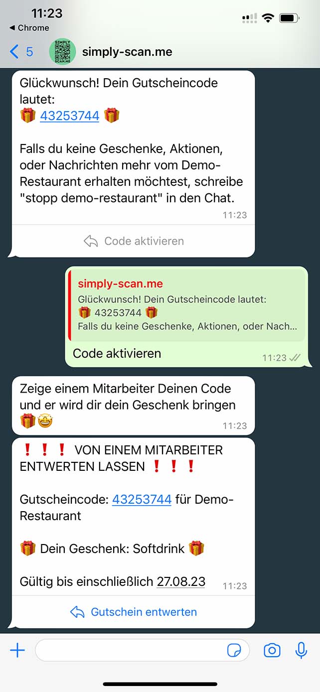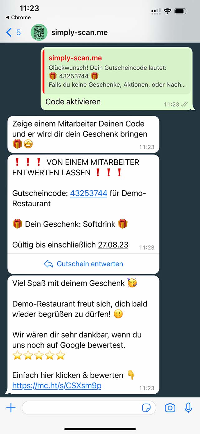 Der User wird aufgefordert, seinen Gutschein durch eine/n MitarbeiterIn bei Dir vor Ort im Ladengeschäft oder Restaurant einlösen zu lassen. Wenn Du ein gutes Geschenk ausgesucht hast (z.B. einen Kaffee), macht Dein Kunde bestimmt nun noch zusätzlichen Umsatz.